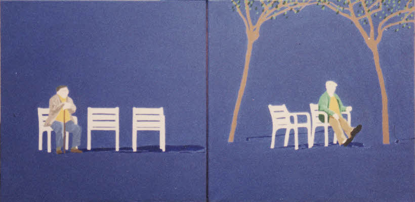 2 old men in a park in Barcelona (diptych), 1998 acrylic on canvas 12" / 24" (300 / 600mm) Private collection of Lidia Peyret-Castro