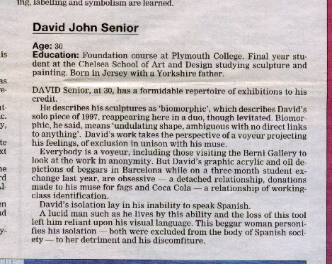 As well as three dimensional work, David is also showing two dimensional work, in the form of paintings, [ Unwanted, Unwanted 2, Unwanted 3 & Orphan ] which were created whilst on a four month stay in Barcelona at the Fine Art department of the Barcelona University. These paintings derive from David's experiences of being alienated and isolated in a foreign and unfamiliar culture, noting the differences and similarities across borders, and the similar struggle that many endure in the class societies that exist in all nations."
